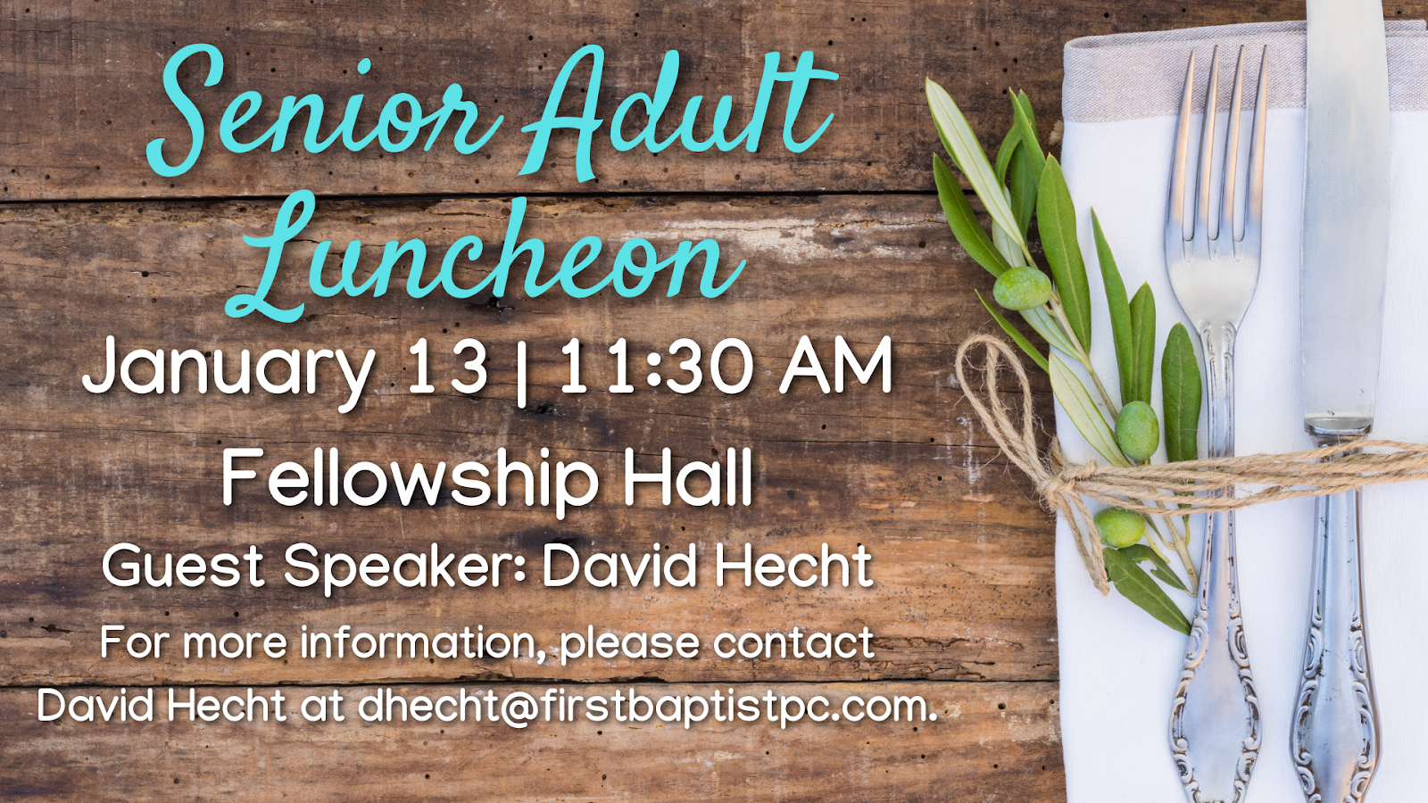 Senior Adult Luncheon Thursday, January 13, 2022 10:30 AM 11:30 AM First Baptist Church of Panama City 640 Grace Avenue Panama City, FL, 32401 USA (map) Google Calendar ICS Please join us for the Senior Adult Luncheon at 11:30 AM in the Fellowship Hall. We will be having roast beef, mashed potatoes, field peas, rolls and pie. Our guest speaker will be David Hecht.
