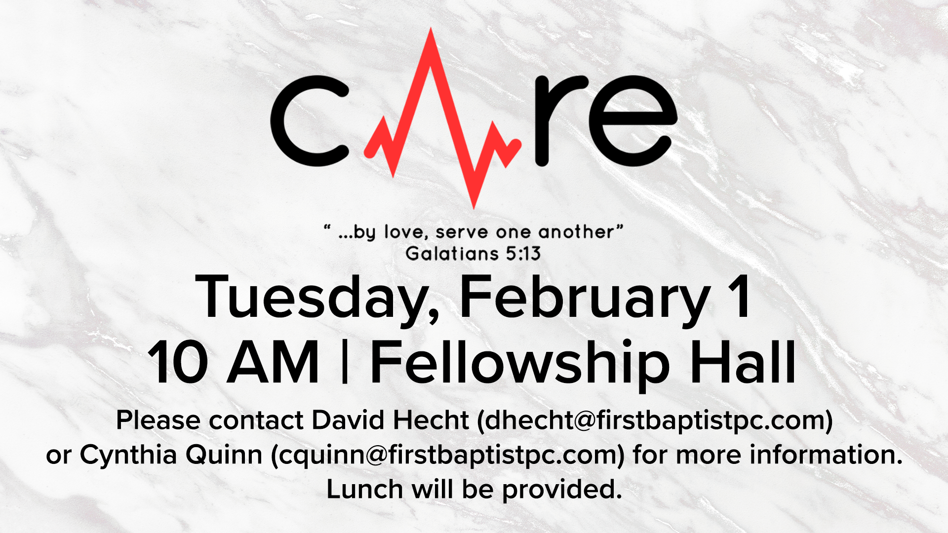 CARE Ministry Team Tuesday, February 1, 2022 9:00 AM 10:30 AM First Baptist Church of Panama City 640 Grace Avenue Panama City, FL, 32401 USA (map) Google Calendar ICS CARE Ministry Teams write cards, visit homebound members, and visit members in nursing homes. Join the CARE Ministry and encourage our homebound members. Teams meet at 10:00 AM on Tuesdays in the Fellowship Hall. Lunch will be served.
