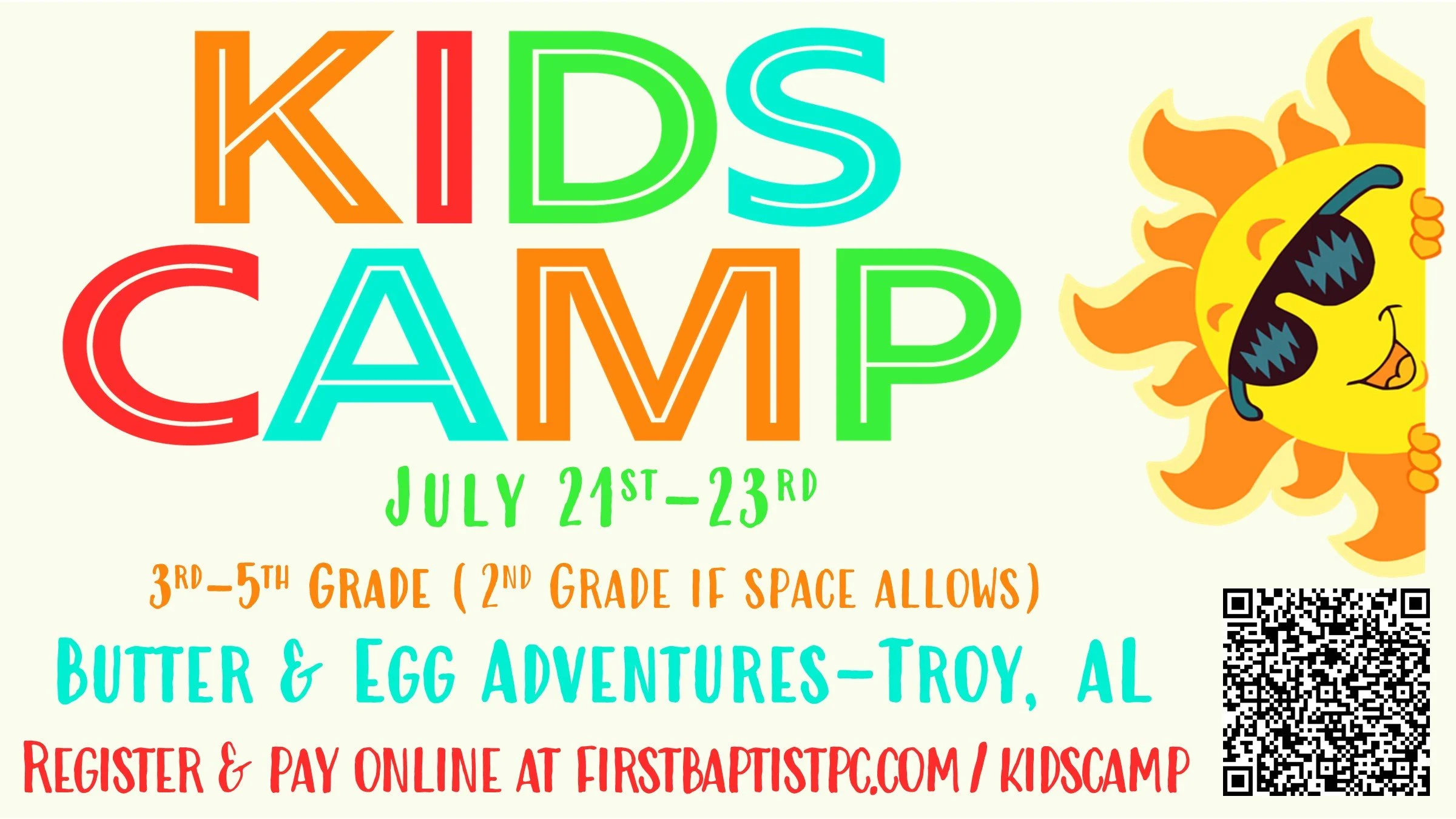 We are so excited to have fun together & to grow in our faith at this amazing Kids' Camp! Registration for 3rd-5th Graders only(completed grade by camp) is through March 1st. If there are spots available after March 1st, we will open registration to 2nd Graders through April 2nd.