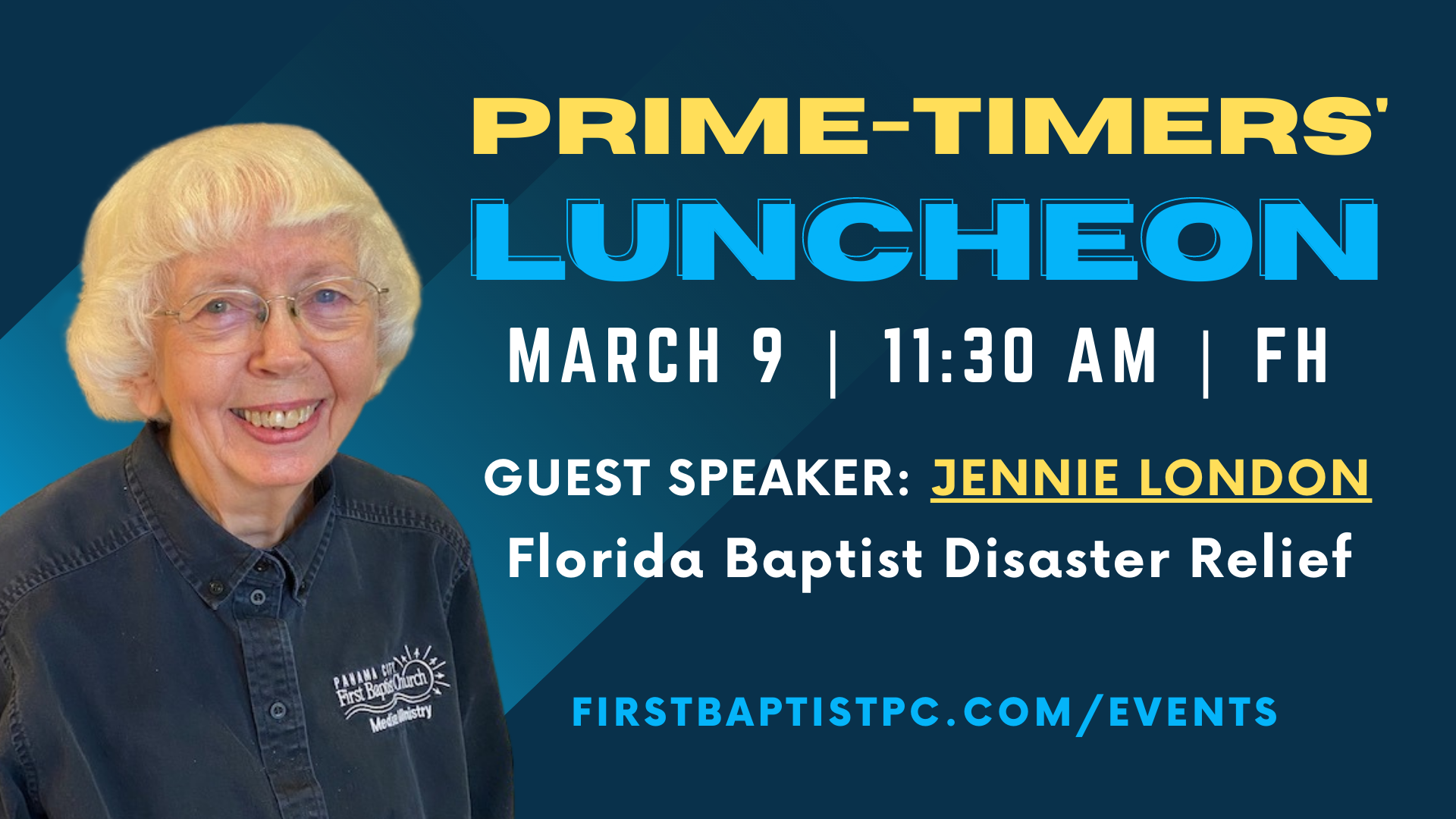 You are invited to our Prime-timers’ Luncheon on March 9, at 11:30 AM in the Fellowship Hall as Jennie London talks about the important ministry of our Florida Baptist Disaster Relief Ministry! You won’t want to miss the warm fellowship, great lunch, warm inspiring presentation!